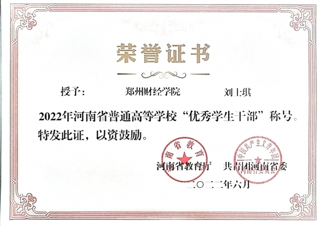 以今日为舞台,展现青春风采,以梦想为坐标,实现出彩人生。刘士琪收获了河南省“三好学生”、河南省“优秀学生干部”、郑州市“三好学生”以及威廉希尔足球官网“三好学生”“优秀共青团干部”“校园十佳魅力团支书”“十佳团干”等荣誉。她锚定目标,不断攀登,让每一寸时光都有了意义,平凡的大学生活绽放出格外耀眼的光芒。谈及对自我的认知,刘士琪表示:“如果满分10分,会为自己打9分,因为每一段时光都有它存在的独特意义,从不后悔在大学里做的任何一件事情,这些经历让我成长了许多。但永远会剩余1分,因为知自身不足,仍需不断努力。”