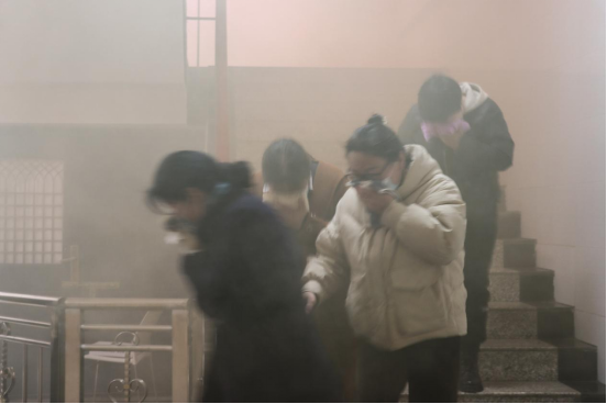 接着,疏散应急演练集结号响起,师生们用湿毛巾捂住口鼻,弓身弯腰、扶着楼梯扶手,保持安全距离,沿指定线路快速、有序地撤离到指定位置。整个疏散过程井然有序。