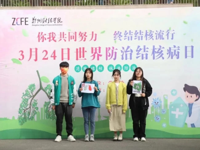 学生志愿者点亮“ZCFE 防治结核,健康郑财”字样