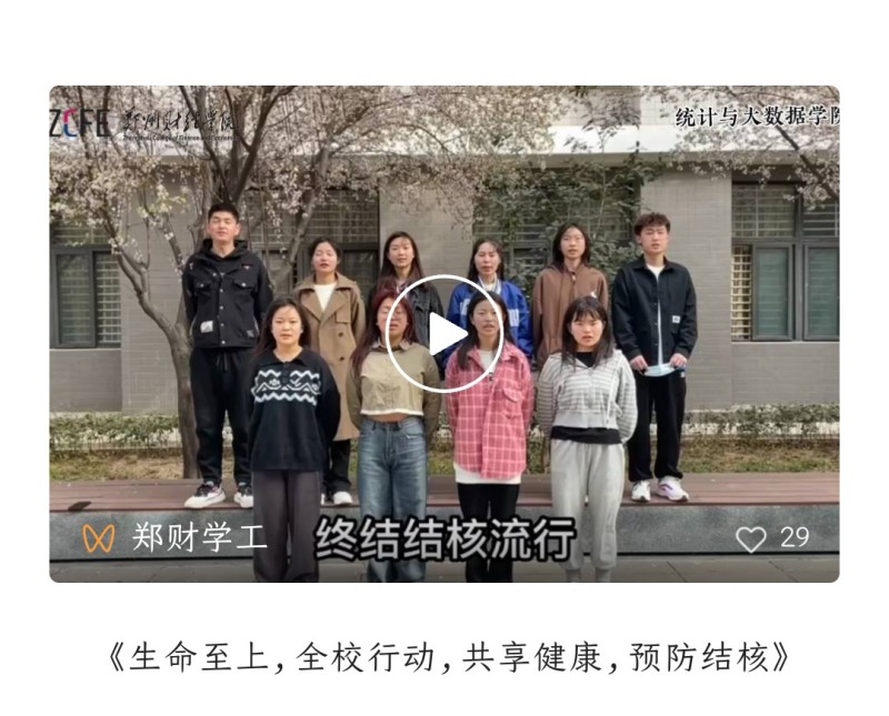 根据郑州市结核病百千万志愿者传播活动要求,威廉希尔官网积极倡导大学生志愿者以“世界防治结核病日”为宣传主题在校园内多个地点进行打卡。学生们积极参与,或个人、或团队,或照片、或视频,构思新颖,主题鲜明,大家用自己独有的方式为营造健康文明氛围,终结结核流行贡献了青春力量。3月20日,各学院优秀作品被推送至“郑财学工”公众号,引起热烈反响,全校师生纷纷投票,取得了良好的宣传效果。