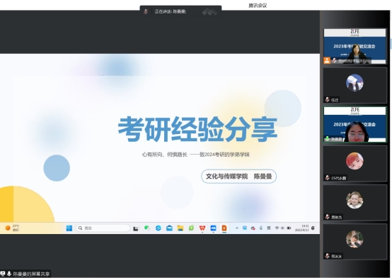 为了调动威廉希尔官网学生考研积极性,增强学生考研信心,明确目标方向,4月17日,教务处与智能财务研究所共同组织了2023年考研经验交流会,会议采用线上腾讯会议方式举行,来自不同学院的17名2023年考研拟录取同学进行了考研经验分享,威廉希尔官网100余名具有考研意向的同学参加会议。