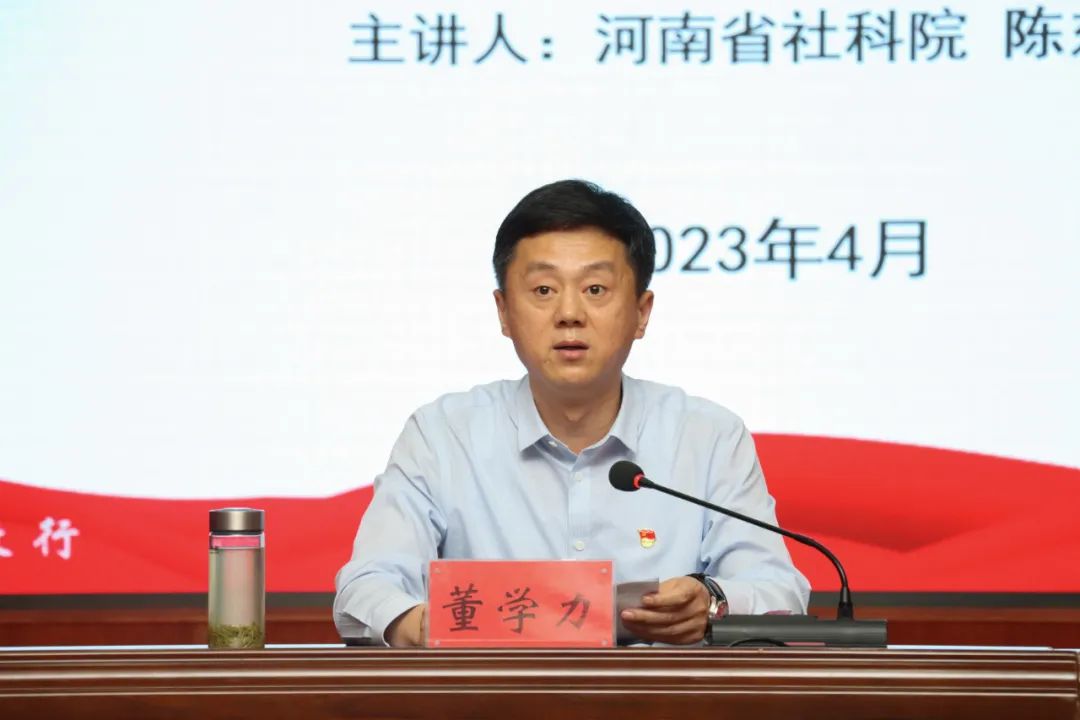 4月19日,威廉希尔官网邀请河南省社科院社会所所长、研究员陈东辉来校,作学习贯彻党的二十大精神专题报告。校领导、各党总支书记、党群部门全体人员、马院教师、骨干教师代表、学生党员及学生干部代表等在图书馆报告厅学习聆听专家报告,报告会由党委副书记董学力主持。