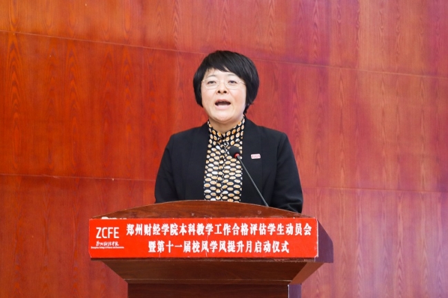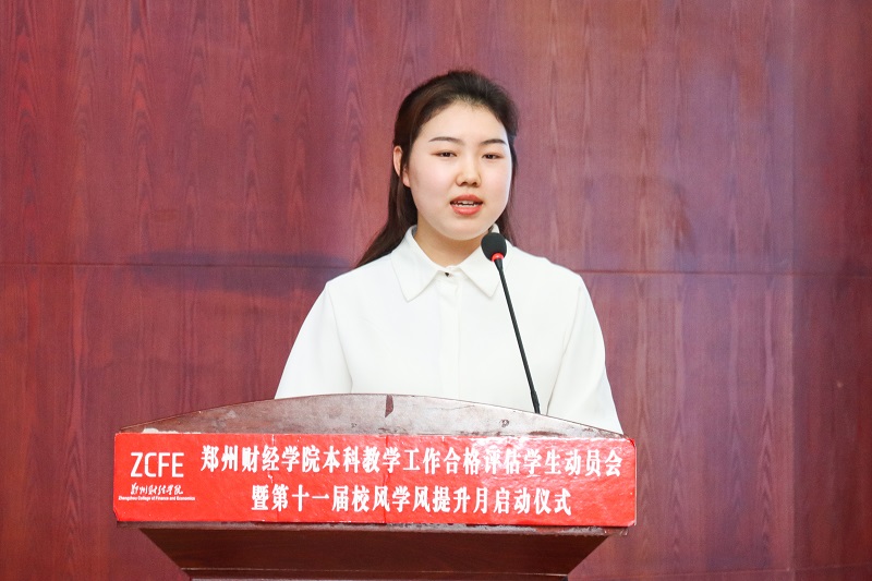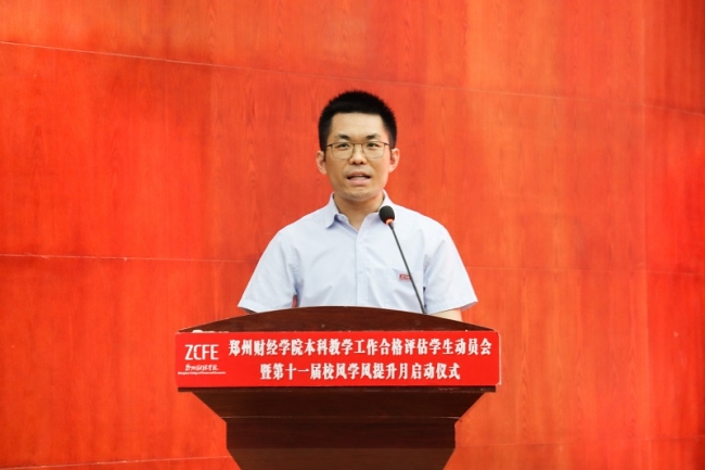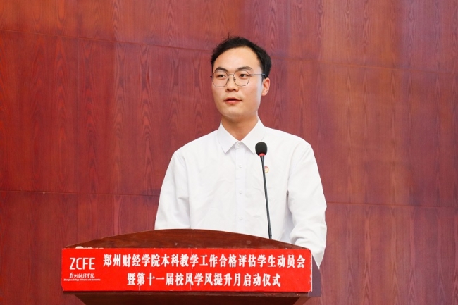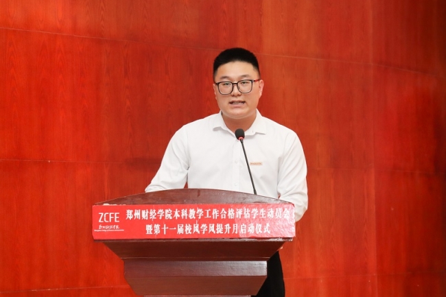 校团委学生兼职副书记郭兴润代表校学生会全体学生干部宣读了《我为学校添光彩,我为评估做贡献》倡议书,倡议同学们积极主动地投身到迎评促建工作中来,发扬学校优良传统,展现郑财学子良好的精神风貌,贡献青春力量。