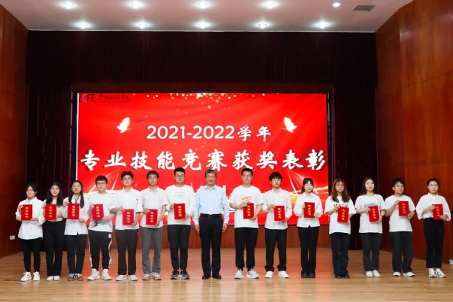 校监事会主席李庆阳、副校长张顺利分别为2021-2022学年专业技能竞赛获奖学生代表、2022年第八届校园卓越学子学生代表颁奖。