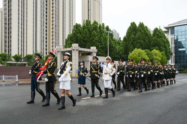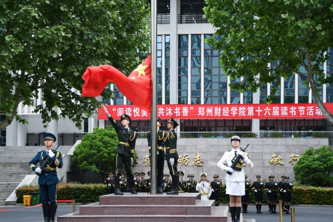 英姿飒爽的国旗护卫队迈着整齐坚定的步伐,以饱满的热情、挺拔的姿态,正步走向升旗台。仪式在雄壮的歌声中拉开帷幕。