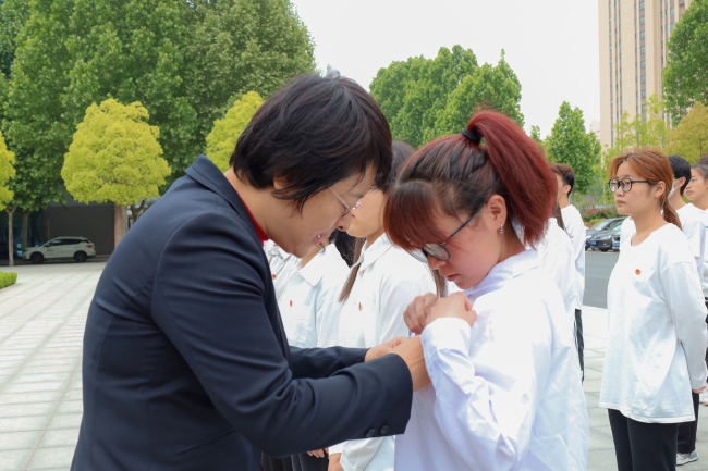 副校长陈静和出席教师为86名新发展团员佩戴团徽。