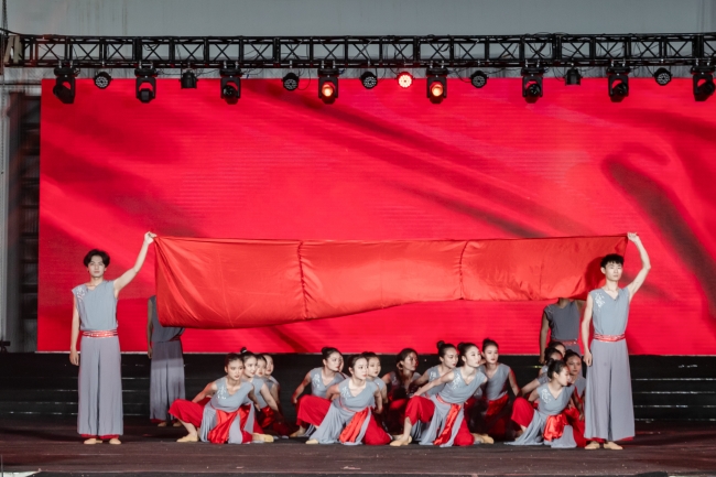 舞蹈《我心中的红》,舞台上鲜艳的五星红旗迎风飘扬,血与火的红色记忆在脑海中不断涌现,坚毅的目光追随着一抹明亮的红,那一抹红是心中的红,是我们追随的光。