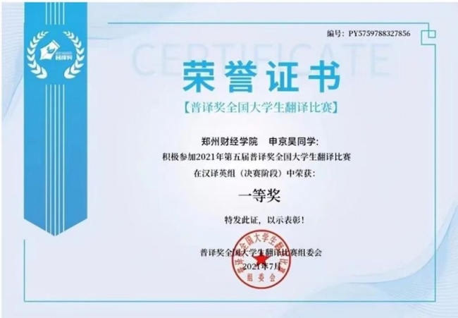 申京昊参加2021年第五届普译奖全国大学生翻译比赛荣获汉译英组一等奖