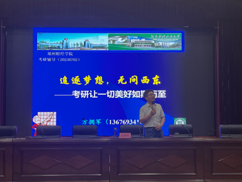 方拥军教授以《追逐梦想 无问西东——考研让一切美好如约而至》为主题,以两部电影《芳华》《无问东西》引入,不仅使师生感受到了那个特殊年代战争与命运的残酷,也使80、90和00后这些没有经历过动荡时代的人看到了父母那一代人的成长、矛盾、理想与追求。方教授嘱咐同学们要珍惜当下来之不易的大学生活,思考如何做好新时代的答卷人,并以一首诗《苔》让大家领悟诗中的人生。他还通过自身的职业轨迹讲述了梦想奋斗的故事,详细介绍了研究生报考择校、复试以及最后冲刺阶段的注意事项。同学们认真聆听,备受鼓舞,反响热烈,现场多次出现雷鸣般的掌声。暑假留校考研学生纷纷表示接下来会努力学习,不负青春、不负韶华、不负时代。