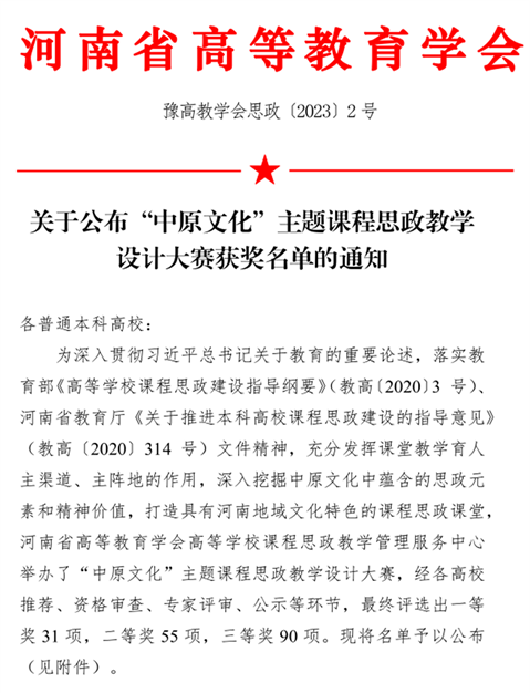 近日,河南省高等教育学会公布了“中原文化”主题课程思政教学设计大赛获奖名单,威廉希尔官网智能工程学院刘一扬、金融学院杨贵仓、管理学院刘文三位教师荣获二等奖。