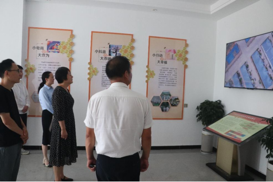 副校长陈静一行在大周镇蜂产品产业园区主任李红强的带领下,观看双庙李村宣传片,多年来双庙李村将特色产业发展作为“和美乡村”建设工作的根基,依托自身产业优势,以发展农村电子商务为抓手,打造出了独特的直播电商产业,被阿里巴巴评选为“中国淘宝村”。李红强对双庙李村经营的主打产品蜂蜜、蜂蜡及蜂机具进行介绍,经过多年发展,双庙李村逐步形成集生产、销售、物流、服务为一体的完整蜂产业链条,每年双庙李村生产的各式各样的蜂产品运往全国各地,走向全球,经济得以迅速发展。
