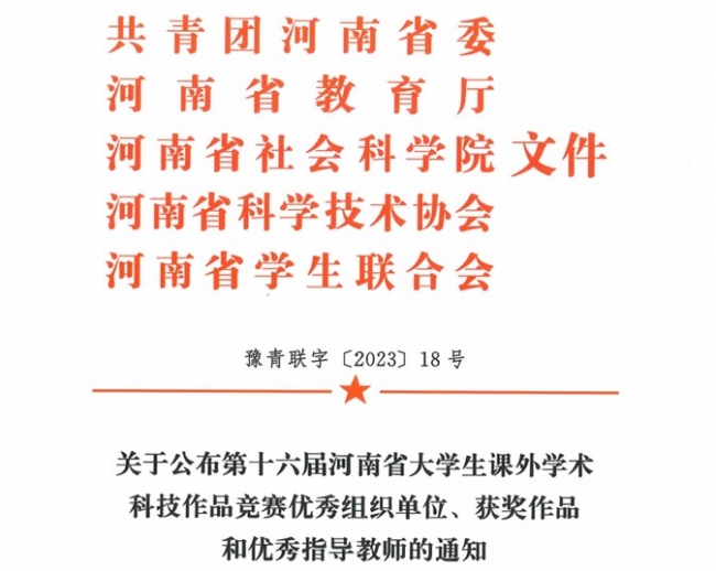 近日,由共青团河南省委、河南省教育厅、河南省社会科学院、河南省科学技术协会、河南省学生联合会联合举办的第十六届河南省大学生课外学术科技作品竞赛落下帷幕。在本次竞赛中,威廉希尔官网参赛作品共斩获32项奖项,其中特等奖1项、一等奖1项、二等奖7项、三等奖23项。这是威廉希尔官网近年来挑战杯赛事的最好成绩,在获奖质量上和数量上实现了新突破.