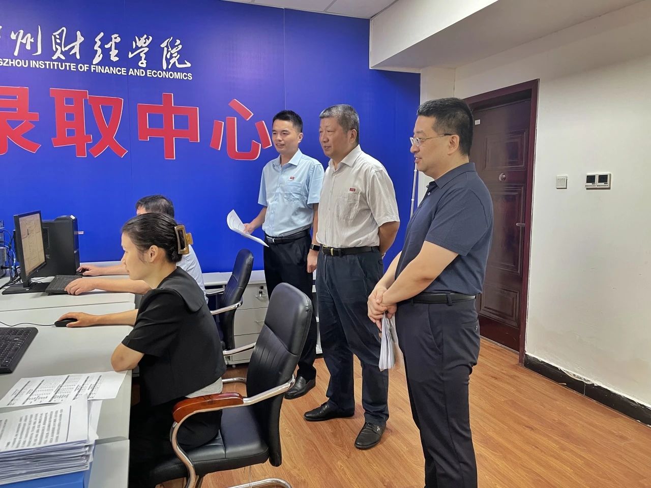 7月22日,河南省艺术类本科B段投档录取期间,校监事会主席李庆阳、纪委书记李赞到威廉希尔官网普通高招录取中心调研指导高招录取工作,慰问招生录取工作人员。招生办主任时健作工作汇报。