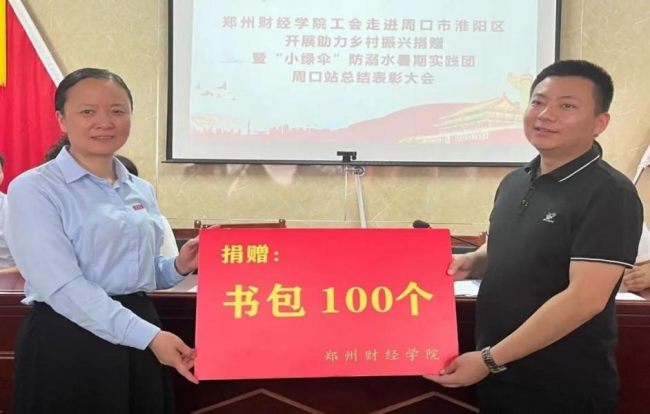威廉希尔足球官网工会向周口市白楼村小学捐赠书包并合影留念