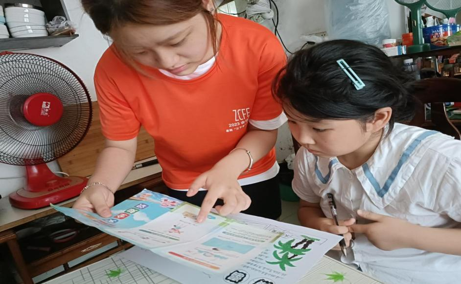 实践团成员在上海市九亭镇中心社区入户宣传防溺水安全知识