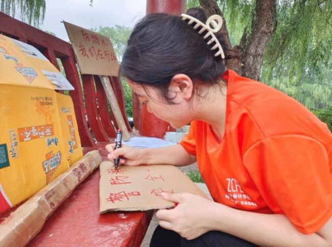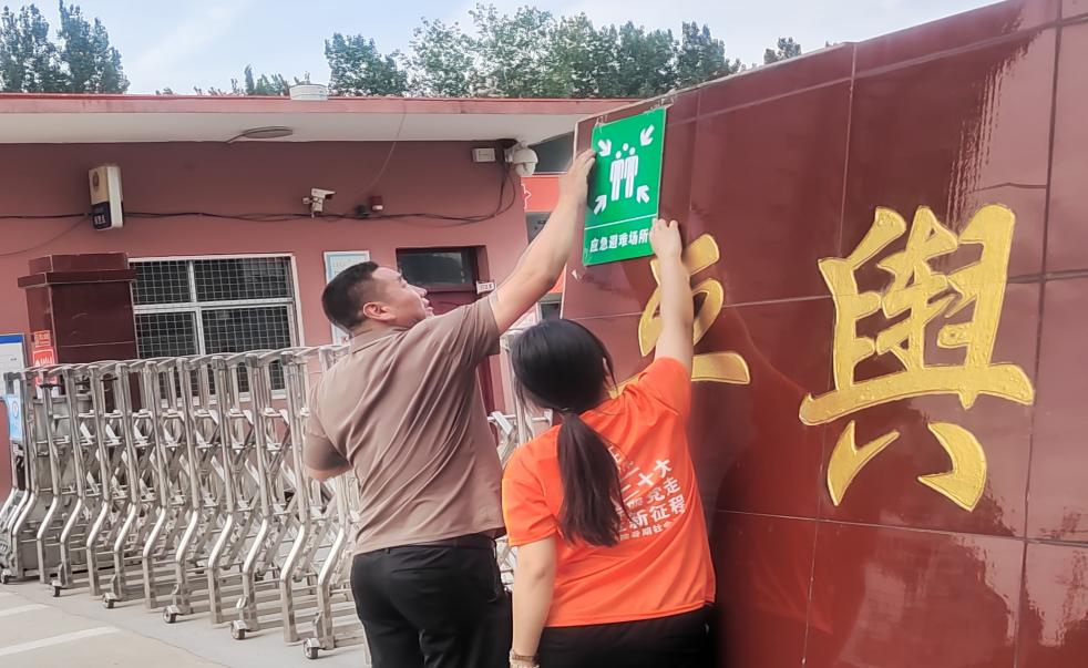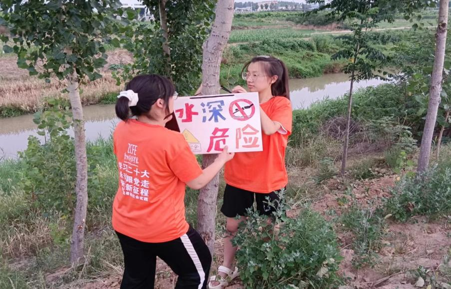 实践团成员在新乡市黄河支流文岩渠旁悬挂防溺水警示牌
