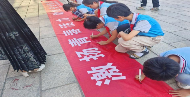 山西省阳泉市盂县第四实验小学学生在防溺水条幅上签字
