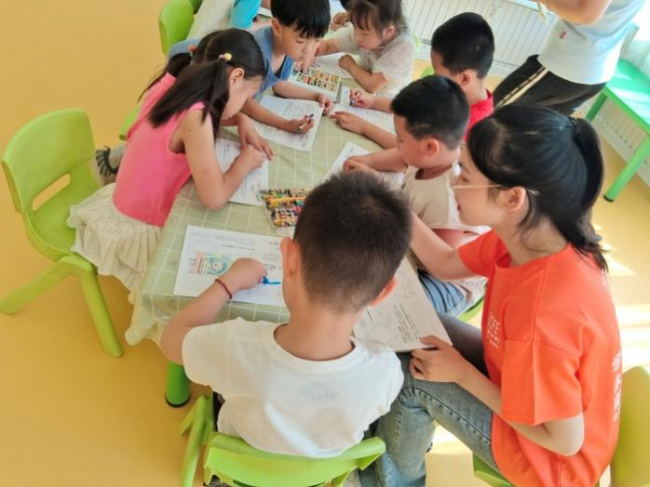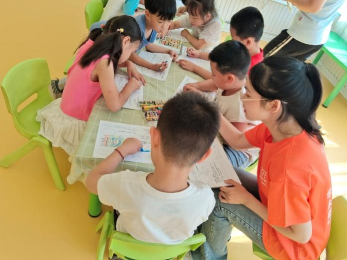 实践团成员在辽宁省沈阳市海韵东方幼儿园和小朋友们一起涂画防溺水手绘卡