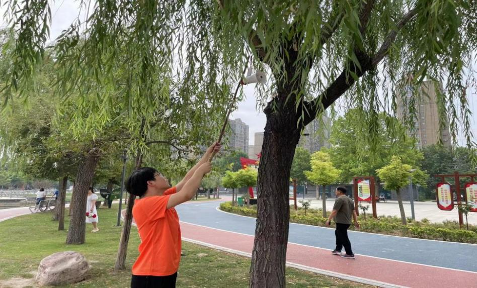 实践团成员在黄河水域公园协助工作人员悬挂防溺水宣讲喇叭