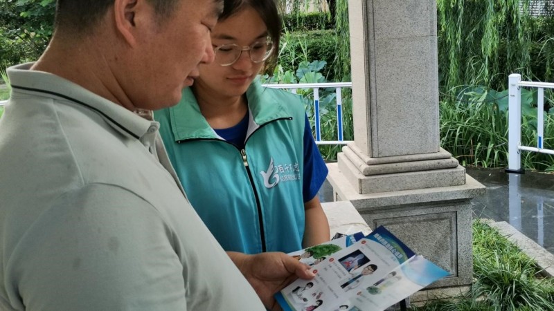 护“肺”先锋志愿宣讲团成员在南阳市铁路麒麟小区为居民发放宣传页