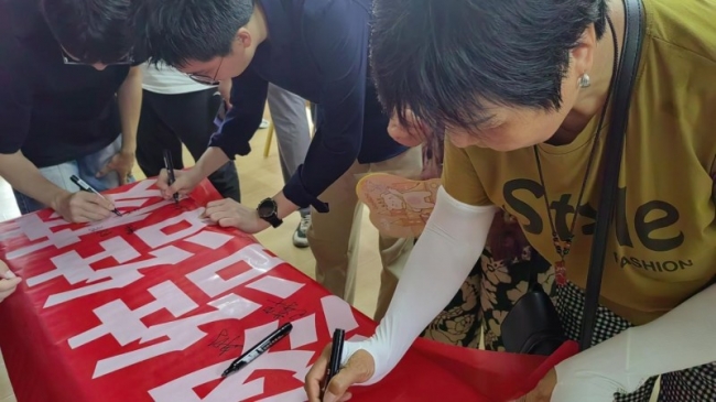 裕华社区居民在承诺终结结核的横幅上签字