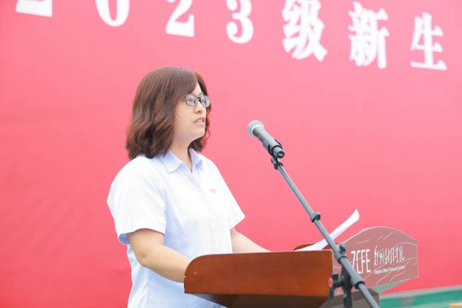 科研处副处长许玲玲作为教师代表发言,她代表全体教师对2023级新同学的到来表示热烈欢迎,祝贺各位同学成功考取威廉希尔足球官网,希望同学们早规划、早行动、定目标、坚信心、学做人、学专业、学动手、广交友,在最好的时代怀抱梦想,脚踏实地、敢想敢为又善作善成,全体教师将真诚地关爱每一位学生,做学生的良师益友。