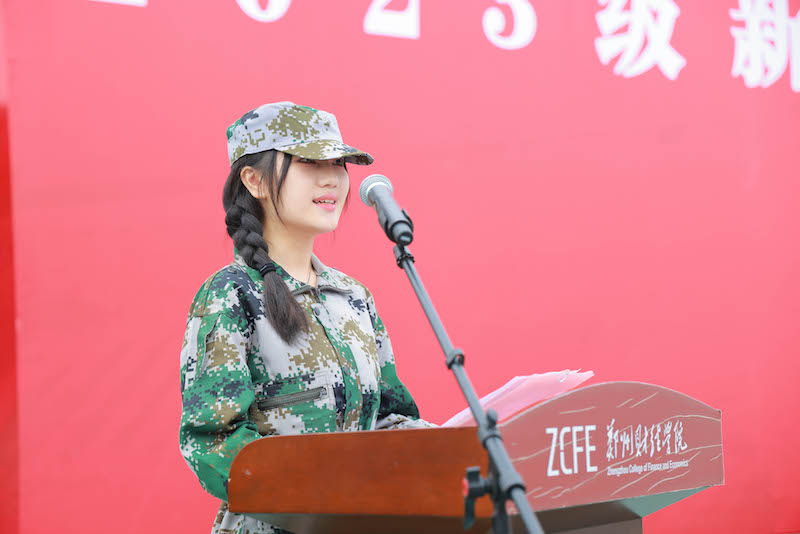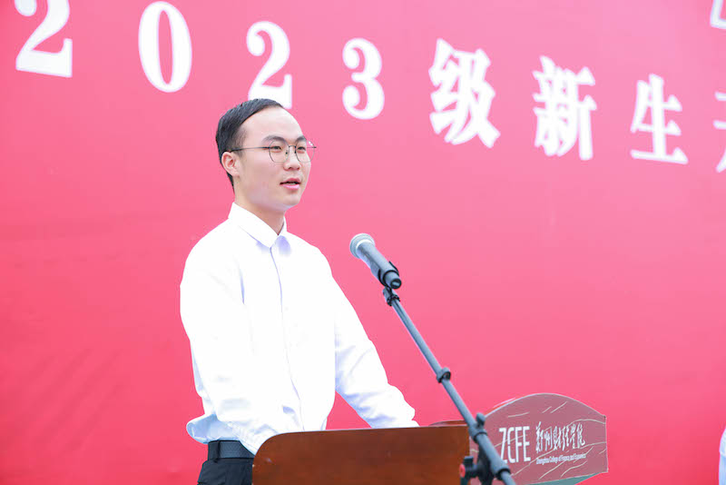 会计学院2020级财务管理本科1班贾成旭作为学生代表发言。他以拼搏奋斗的亲身经历告诉2023级全体新生,青春是用拼搏的汗水和意志的血滴酿成的琼浆,历久弥香,经受住成长的淬炼,终将大有可为。他鼓励新生们带着郑财学子的青春使命,勤奋学习,增长本领,为实现中华民族伟大复兴的中国梦贡献青春力量。
