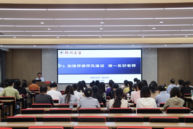 首先,由特邀嘉宾郑州大学教务处副处长潘志峰教授以《加强师德师风建设 做一名好老师》为题为新教师作专题报告。他以党的十八大以来党中央对我国教育、教师的重视和举措为切入点,从民族命运、学校荣誉、个人理想三个层面,围绕“好教师的标准、师风师德建设、教学规范、教学改革”四个方面,用富有哲理的语言、生动鲜活的案例,深入浅出地向大家诠释了作为一名新教师如何坚守初心使命、提升个人师德修养,成为一名好老师。