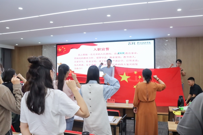 在教师发展中心副主任赵晓宇的带领下,2023年新入职教师面向国旗庄严宣誓。铮铮誓言,铿锵有力,宣告着新教师教育生涯的开启,也代表着新教师对教育事业的承诺。