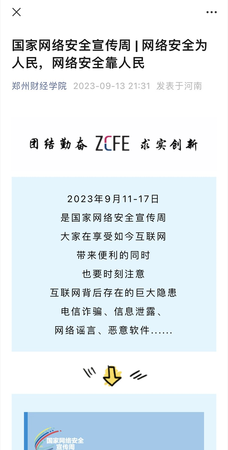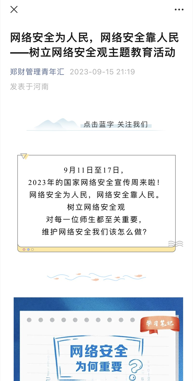 学校成立了网络信息安全管理工作领导小组,全面负责网络安全管理工作的实施与管理,不断完善网络安全规章制度。制定并下发《关于组织开展2023年国家网络安全宣传周河南省校园日活动的通知》,动员全校师生积极参与网络安全周系列活动,组织全体师生学习安全管理基本常识,营造人人学网络安全、懂网络安全、重网络安全的浓厚氛围。