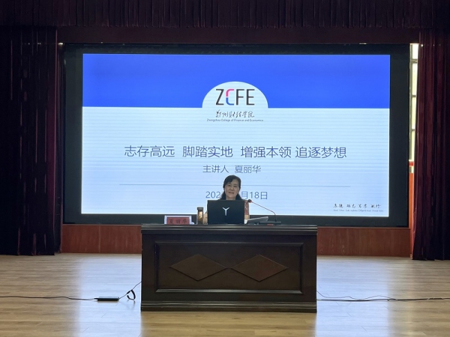 文化与传媒学院院长夏丽华作《志存高远 脚踏实地 增强本领 追逐梦想》专题讲座,带领新生了解郑财、了解专业,做好大学规划,勉励学生在大学期间要提升能力本领,勇敢追逐梦想。