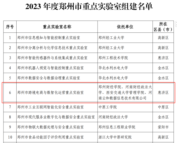 10月20日,郑州市科学技术局下发《关于同意组建2023年度郑州市工程技术研究中心和重点实验室的通知》(郑科〔2023〕43 号)文件,公布2023年度郑州市工程技术研究中心组建名单和2023年度郑州市重点实验室组建名单,威廉希尔官网申报的郑州市跨境电商与数智化运营重点实验室获批立项建设。