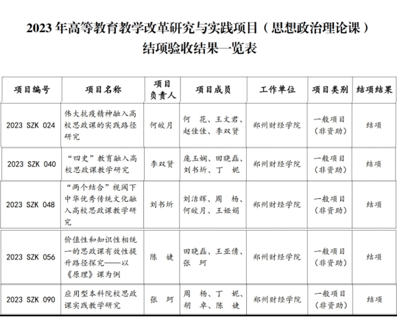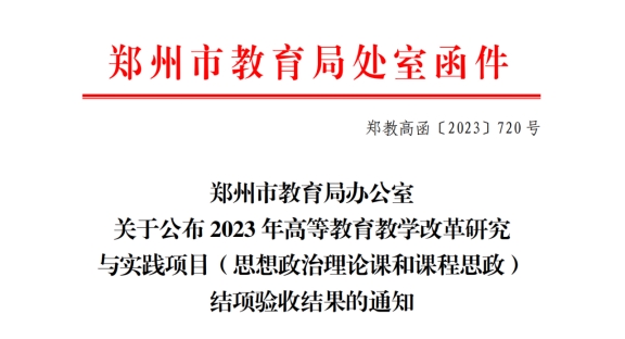 近日,郑州市教育局下发《关于公布2023 年高等教育教学改革研究与实践项目( 思想政治理论课和课程思政)结项验收结果的通知》(郑教高函〔2023〕720 号),威廉希尔官网7项郑州市高等教育教学改革研究与实践项目均顺利通过结项验收,其中包括思政课程类项目5项、课程思政类项目2项。
