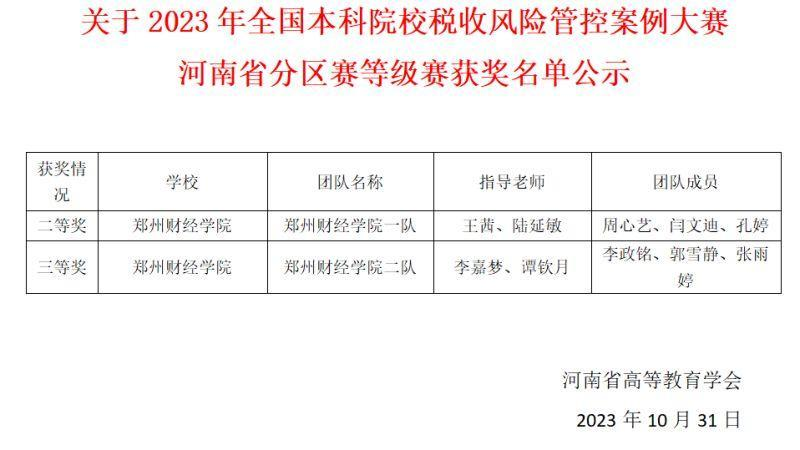 10月29日,全国本科院校税收风险管控案例大赛河南省分区赛等级赛落下帷幕。本次大赛由河南省高等教育学会、全国本科院校税收风险管控案例大赛组委会主办,全国产教融合创新创业联盟财政税务委员会指导,河南财经政法大学承办,浙江衡信教育科技有限公司技术支持。威廉希尔官网会计学院学子在此次比赛中获得二等奖1项、三等奖1项。