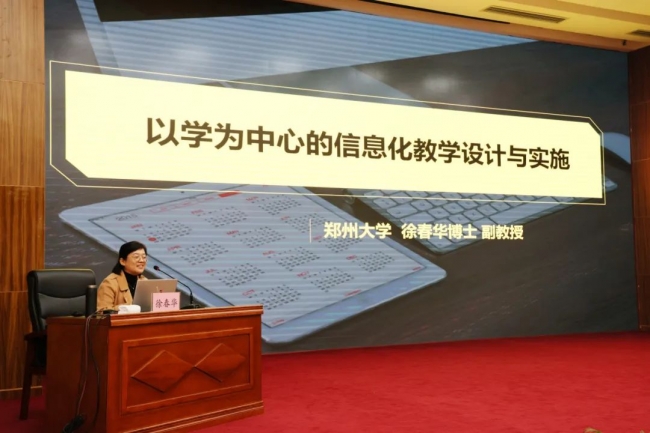 开班仪式结束后,教育技术学博士、郑州大学徐春华副教授以《以学为中心的信息化教学设计与实施》为题作开班报告。她以深厚的理论沉淀和丰富的实践经验,围绕以“学”为中心这个基本点,从课堂改革背景下教师的数字化转型、信息化教学设计的要点和步骤、信息化教学的实践方法等方面,分享了信息化教学的体会。徐博士的报告深入浅出,内容丰富,既注重理论上的解读,又注重结合实际分析,对参训学员教学信息化能力的提升和转型具有很强的指导作用,使其对教学改革有了新的思考。