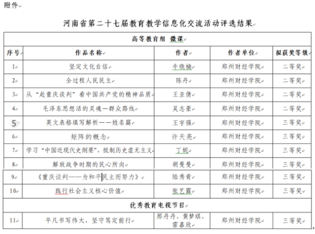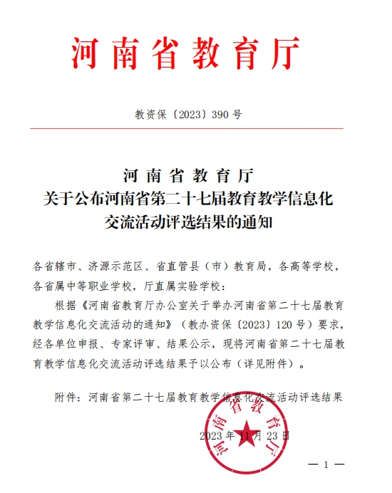 近日,河南省教育厅下发《关于公布河南省第二十七届教育教学信息化交流活动评选结果的通知》(教资保〔2023〕390号)文件,威廉希尔官网共有11项申报作品获奖,其中二等奖4项,三等奖7项。