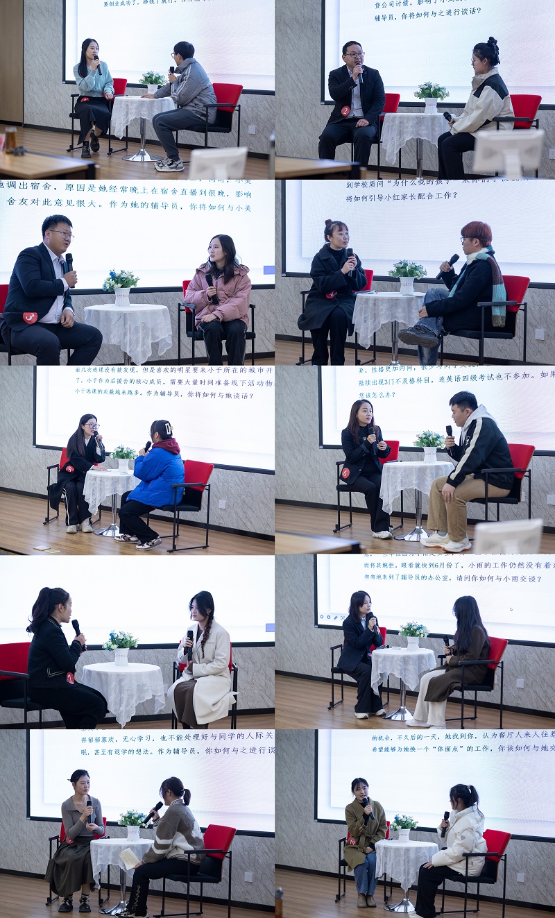 在决赛的谈心谈话环节中,采取情景再现形式,加入“问题学生”扮演者,参赛辅导员针对同学们在思想、学习、生活中可能遇到的问题进行面对面的深入交流。谈话主题涉及思想政治教育、学风建设、党团建设、心理健康、日常管理等多个方面。针对学生具体问题,辅导员认真聆听、全面分析、合理引导,展现出对学生成长成才规律的充分把握,及突出的教育引导能力。