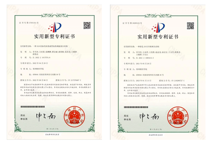 专业学习弄懂以后,她开始突破自我,尝试阅读专业领域的著作与论文,跟随老师参加专利的研发,与老师、同学探讨学术问题。在一次次的探索与磨砺中,王晓妍执着学海的脚步更加坚定。目前,她参与的研发团队成功申请“一种SLM设备用高效成型加热调温基台结构”“一种彩色3D打印机喷头结构”“一种金属3D打印循环供料上料装置”“一种智能加工中心用油水及金属碎屑集中分离装置”“一种柔性面积可调风力发电机用风叶结构”等五项专利,成为专业学习方面的佼佼者。