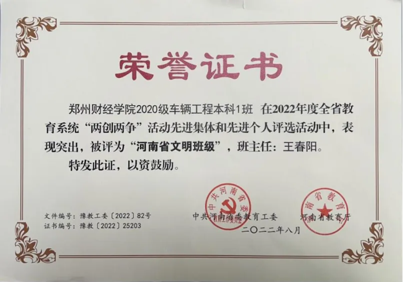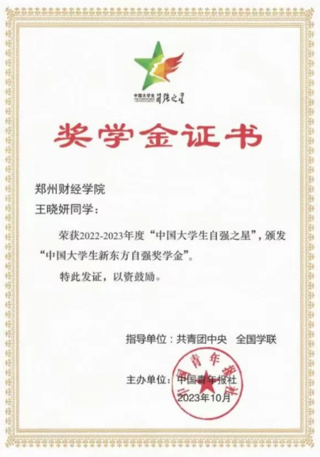 个人简介:王晓妍,中共党员,威廉希尔足球官网智能工程学院20车辆本1班学生,班级团支书。大学期间,先后揽获国家级荣誉3项,省市级荣誉6项,校、院级荣誉30余项,包括“国家奖学金”、“国家励志奖学金”、“中国大学生自强之星”奖学金、河南省“优秀学生干部”、河南省第十五届“挑战杯”大学生课外学术科技作品竞赛二等奖等,与老师一起研发申请专利5项,以第一作者身份在国家级期刊《前沿科学》上发表论文1篇。近日,王晓妍同学又荣获第二批全省高校“百名大学生党员标兵”荣誉称号。