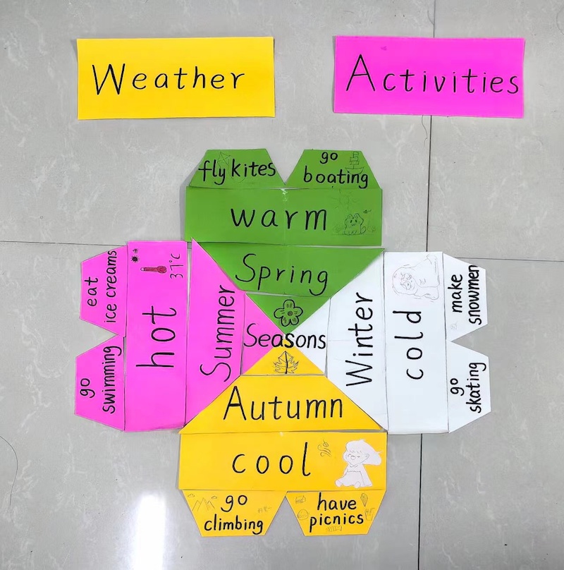 这是《英语课程与教学论》课上教具学习的实践环节。封雨彤老师以现行人教版小学英语教材作为学生实践作业,要求他们依据不同章节内容进行教具设计。学生根据老师下达的任务要求,课下分组完成并在课堂现场演绎。像这样的环节在封雨彤老师的课堂上每学期都会出现3~4次。“同学们不仅要做作品,还要说课,展示他们的课程设计思路。”每一组完成展示后,封雨彤老师会和台下学生一起打分,二者平均分构成该门课程一次作业得分,也是学生平时成绩的重要组成部分。