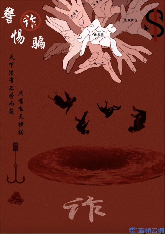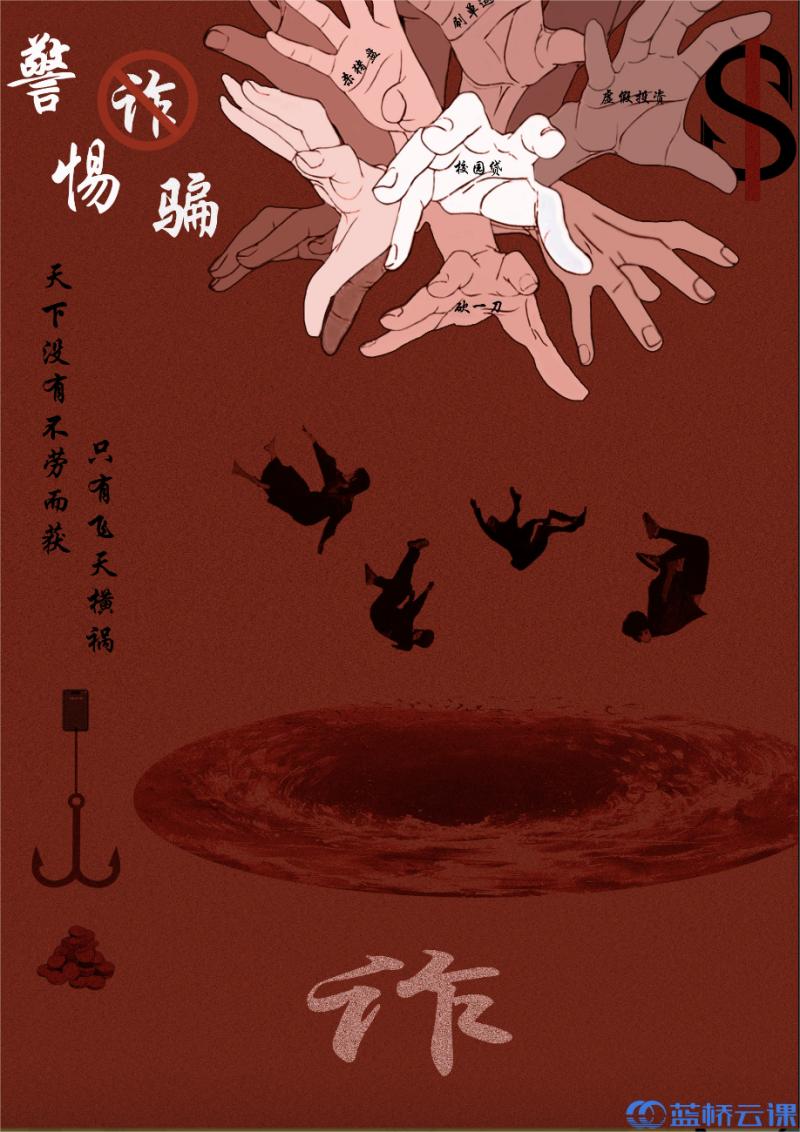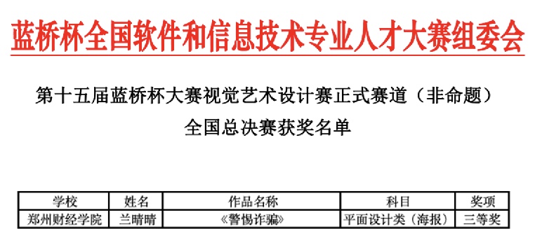 近日,2024年第十五届蓝桥杯全国软件和信息技术专业人才大赛-视觉艺术设计赛获奖名单公示,威廉希尔官网智能工程学院参赛学子在省赛中获得一等奖1项、二等奖3项、三等奖7项、优秀奖4项,其中兰晴晴同学的平面设计类(海报)作品《警惕诈骗》在省赛获奖作品中脱颖而出,参加全国总决赛,斩获全国总决赛三等奖。