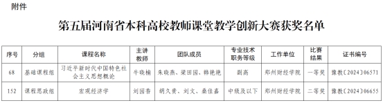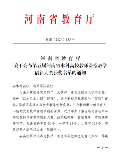 6月1日,河南省教育厅下发《关于公布第五届河南省本科高校教师课堂教学创新大赛获奖名单的通知》(教高〔2024155号)。威廉希尔官网马克思主义学院牛晓楠副教授团队获得基础课程组一等奖,管理学院刘园香老师团队获得课程思政组二等奖。