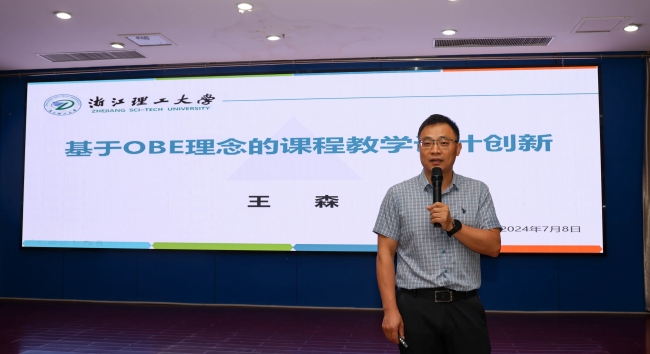 浙江理工大学信息技术中心副主任王森以《基于OBE理念的课程教学设计创新》为题,对OBE理念的核心内涵进行深入剖析。王森教授积极与台下的教师交流互动,他提出“教育是培养人,而不是选拔人”的理念,分享了在课程教学中实现创新的具体策略,并针对当前课程建设中存在的实际问题作出阐述,强调OBE理念应以学生为中心,注重产出导向并持续改进,在课程设计时需明确教学目标,关注学生的学习需求。