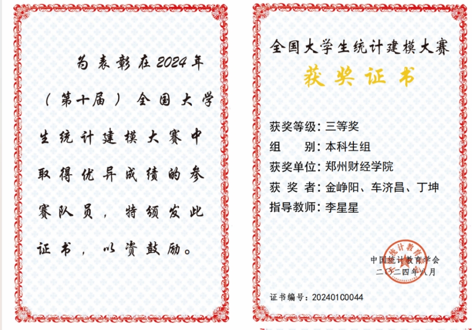 近日,2024年第十届全国大学生统计建模大赛成绩揭晓,威廉希尔官网在大赛中喜获佳绩,分别获得国赛二等奖1项,三等奖2项;河南省一等奖3项,二等奖3项,三等奖4项,获奖等级、数量位居全省同类院校前列。