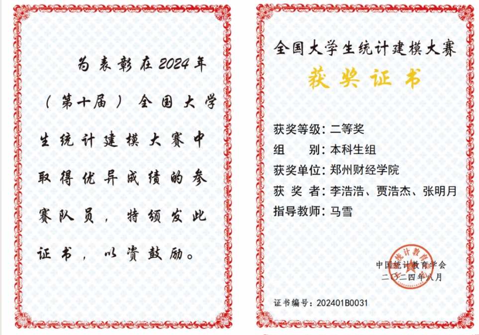 比赛启动以来,在学校教务处大力支持下,统计与大数据学院高度重视,广泛动员,认真筹备,共组织25支本科生团队参赛,学院遴选组建统计建模竞赛指导教师团队,对学生进行培训和指导。经过选拔,共有15支本科生团队晋级河南省赛,其中,3支团队参加省赛答辩环节。经过省赛的激烈评比,参赛团队以新颖的作品选题、科学的统计方法、严谨的内容设计赢得了评委的一致肯定,并获得省一等奖3项、二等奖3项、三等奖4项的优异成绩。一等奖的3支队伍因名次靠前,入围国赛资格,最终获得国赛二等奖1项,三等奖2项。