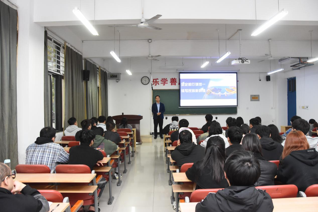张彪副主席为同学们讲授思政课 首先,张彪围绕“实现祖国完全统一,是中华民族走向伟大复兴的历史必然”的基本论点,从“两岸同属一个国家、一个民族的历史事实”、“铸牢中华民族共同体意识”等六个方面引导同学们对台湾问题进行思考,从而让同学们认识到实现祖国和平统一的核心和关键,进一步提高了同学们对台湾问题的认识。 接着,张彪围绕“‘台独’分裂图谋注定失败”的论点展开,从台湾岛内的主流民意、内部环境和外部环境三个方面进行了详细论述,指出不管局势如何变化,都改变不了两岸同属一个中国的事实,改变不了两岸关系的基本格局和发展方向,阻挡不了祖国终将统一的历史大势,更加坚定了同学们和平统一的信心和信念。 最后,张彪从“坚定不移推进祖国统一进程”的美好愿景出发,从五个方面论述了与之对应的系列举措,并指出两岸同胞都是民族复兴的参与者、推动者、获益者。作为当代青年,同学们应当努力学好专业知识,提高自身综合素质,担负起时代赋予的使命和责任,为推进祖国统一进程贡献力量,为实现中华民族伟大复兴奋斗! 授课结束后,同学们纷纷表示张彪副主席的课堂逻辑严密、案例详实,令人意犹未尽。通过本次授课,同学们表示更加深切感受到了祖国统一大势势不可挡,更加坚定了和平统一的愿望,更加确定了自己的未来奋斗目标,愿以自己的实际行动为祖国统一和民族复兴添砖加瓦!
