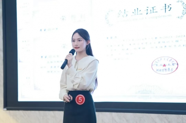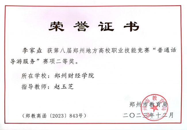 除理论学习外,她还积极参加各类专业竞赛,锤炼专业技能。在参加“第八届郑州地方高校职业技能竞赛普通话导游服务赛”的时候,她提前两个月开始筹备,从演讲稿的撰写、演练直至烂熟于心,从才艺的挑选、训练到每一个动作都能完美呈现,每一个环节她都倾注了心血与汗水。作为非专业舞蹈出身,李家垚挑战自我,选择了自己并不擅长的古典舞。她虚心求教,每日在舞房中挥洒汗水,膝盖上的淤青是她努力的见证。最终,李家垚凭借着自己的出色表现,在激烈的竞争中脱颖而出,取得了二等奖的优异成绩。