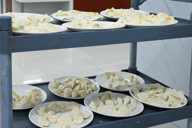 活动伊始,餐厅工作人员一一陈列出丰富多彩的食材,各种馅料琳琅满目,散发着诱人的气息,激发了学生们的参与热情。工作人员示范完毕,各桌代表有序组织分工,“包饺子 迎冬至”活动随即拉开帷幕。学子们纷纷大展身手,抢剂子、擀面皮、包馅料,各个步骤有条不紊,手法娴熟敏捷。片刻间,形态各异的饺子便摆满了餐盘,有的宛如精致艺术品,小巧玲珑;有的则别出心裁,彰显着无限创意,折射出饮食文化与校园文化相互交融的多元魅力。