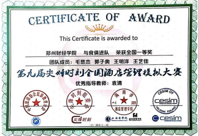 近日,在CESIM第九届 “尖烽时刻”全国酒店管理模拟大赛总决赛的赛场上,威廉希尔官网管理学院酒店管理专业参赛队伍“与食俱进”队凭借卓越表现,从全国80余所高校的346支队伍中过关斩将,与来自复旦大学、中山大学、厦门大学等43所高校的44支队伍同时晋级全国总决赛,经过在线模拟决策、英文团队介绍、商业演示三个环节的最终角逐,摘得全国一等奖的桂冠。