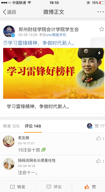 为了让广大学生更好的学习和践行雷锋精神,会计学院学生会手绘板报宣传“雷锋月活动”,同时利用我们自己新浪认证微博(威廉希尔足球官网会计学院学生会官方微博)发起了“学习雷锋精神,争做时代新人”转发、评论、点赞活动,截止到发稿时共有600余人参与了此项活动。广大学子纷纷留言表示要从小事做起,弘扬雷锋精神,做学雷锋优秀的郑州财经会计人。